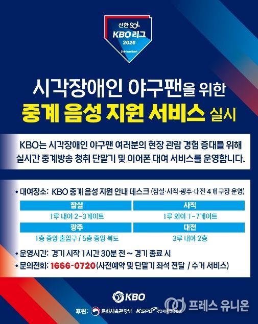 프레스유니온 강찬희 기자 | KBO는 2023년부터 잠실, 사직, 광주 구장에서 운영해 온 ‘KBO 리그 시각장애인 현장 관람객 대상 중계 음성 지원 서비스’를 올해 대전 한화생명 볼파크까지 확대해 총 4개 구장에서 운영한다.