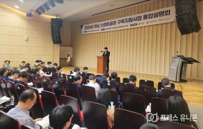 프레스유니온 강찬희 기자 | 경상남도는 28일 경남테크노파크 경남창원과학기술진흥원에서 ‘2026년 경남 스마트공장 구축 지원사업 통합 설명회’를 개최하고, 제조 인공지능(AI) 기반 스마트공장 보급·확산에 속도를 낸다고 밝혔다.