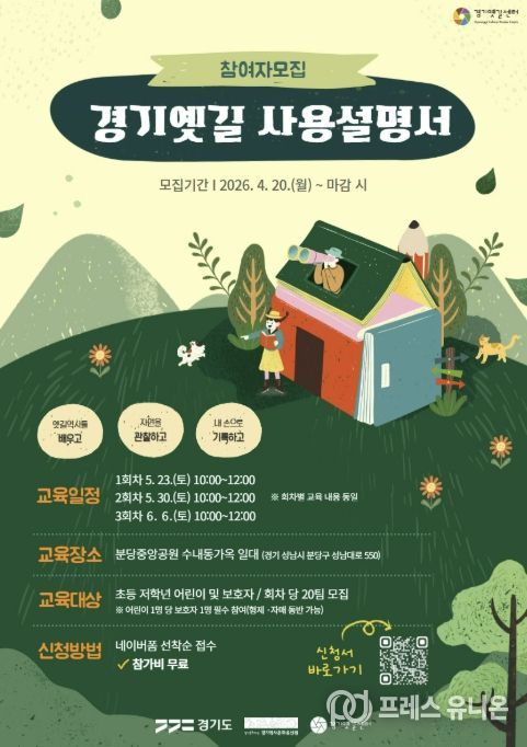 프레스유니온 김성길 기자 | 경기문화재단 경기역사문화유산원은 초등 저학년 어린이와 보호자를 대상으로 하는 역사문화예술 프로그램 ‘경기옛길 사용설명서’ 참가자를 모집한다고 밝혔다.