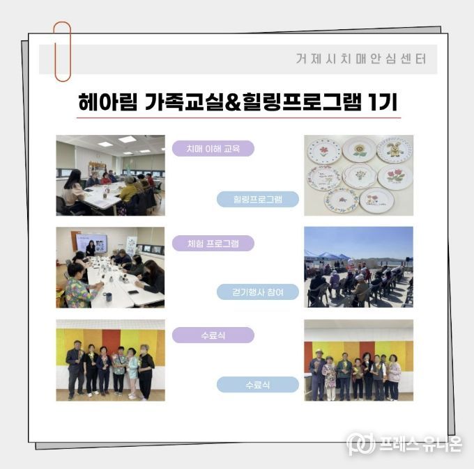 프레스유니온 강찬희 기자 | 거제시치매안심센터는 치매 대상자 가족 지원을 위해 3월부터 4월까지 8주간 ‘헤아림 가족교실’과 ‘힐링프로그램’ 1기를 성공적으로 운영하고 지난주 수료식을 개최했다.