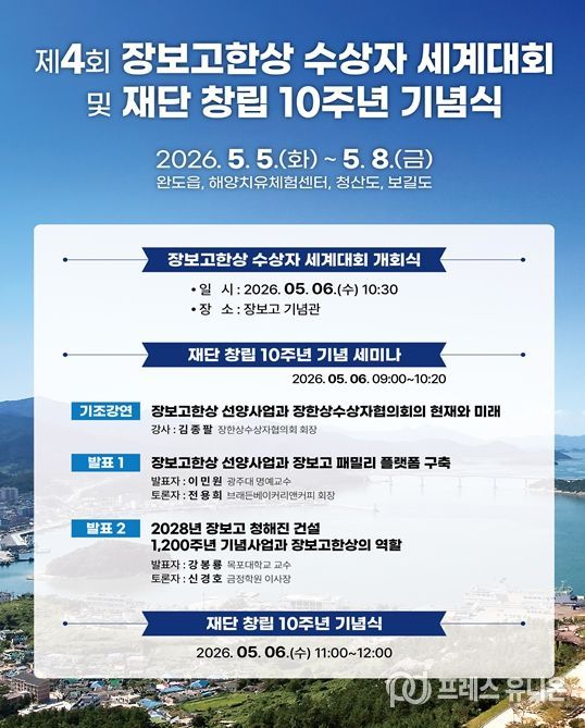 프레스유니온 강찬희 기자 | 사단법인 장보고글로벌재단(이사장 김덕룡)이 창립 10주년 기념식 및 제4회 장보고한상 수상자 세계대회를 5월 5일부터 8일까지 완도에서 개최한다고 밝혔다.