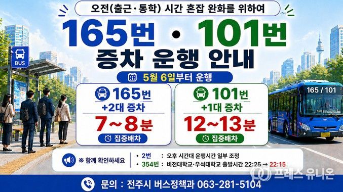 이에 시는 활용 가능한 예비 차량을 혼잡 시간대에 투입해 배차간격을 단축하고, 승객을 분산시켜 차내 혼잡도를 완화하기로 했다. 증차 대상 노선은 165번 노선과 101번 노선으로, 아침 첨두시간대에 집중 배차된다.