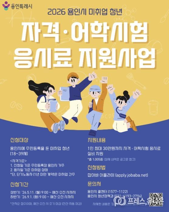프레스유니온 김성길 기자 | 용인특례시는 취업을 위해 어학과 자격증 시험 등을 준비 중인 청년을 위해 응시료 30만 원을 지원한다고 30일 밝혔다.