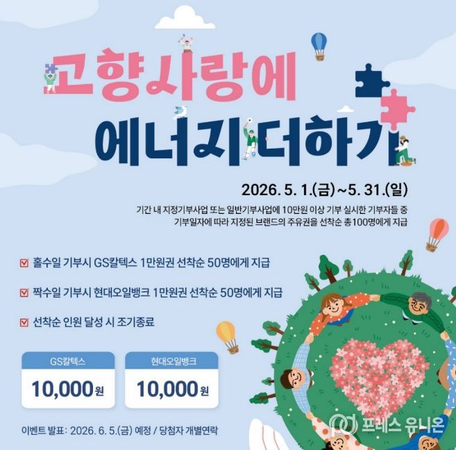 프레스유니온 강찬희 기자 | 원주시는 고향사랑기부제 활성화를 위해 5월 한 달간 특별 이벤트 ‘고향사랑에 에너지 더하기’를 추진한다.
