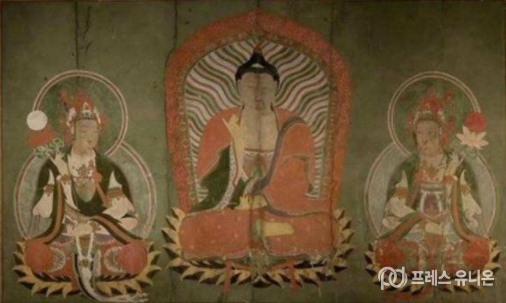 '부산 범어사 대웅전 벽화'는 대웅전 내부 동·서쪽 벽에 그려진 불화 4점으로, 한 공간에 삼불 신앙의 세계가 어떻게 구현됐는지를 보여주는 작품이다. 범어사 대웅전에는 중앙의 목조석가여래삼존좌상이 모셔진 주불단(主佛壇) 뒷벽에 걸린 영산회상도를 중심으로, 동쪽 벽에는 동방 유리광정토를 주관하는 약사여래삼존도 벽화가, 서쪽 벽에는 서방 극락정토를 주관하는 아미타여래삼존도 벽화가 배치되어 있다.