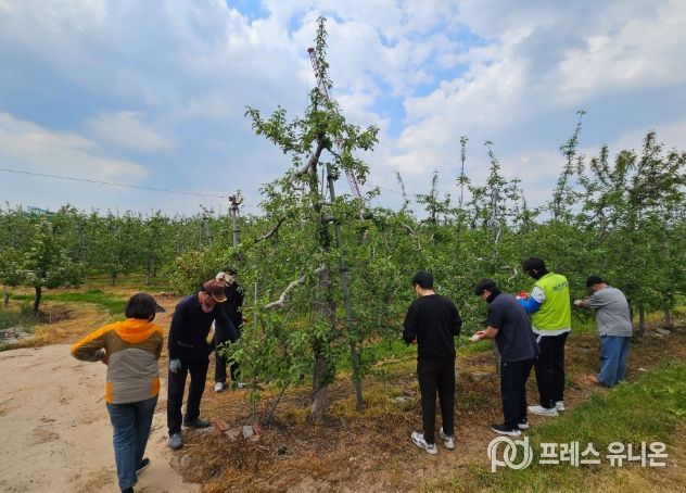 이번 일손돕기에는 직원 18명이 참여해 사과 열매솎기 작업과 전지목 제거 등을 지원하며 일손 부족으로 어려움을 겪는 농가에 힘을 보탰다.