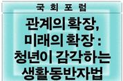 전국신문언론노동조합 강찬희 기자 | 6 3 지방선거를 앞두고 다양한 청년정책이 발표되는 가운데, 청년 당사자가 직접 청년정책으로서 생활동반자법의 의미와 필요성을 조망하는 국회포럼이 개최된다. 이날 포럼에는 50여 명의 청년 당사자가 참석해 생활동반자법에 대한 의견을 나눌 예정이다. 기본소득당 용혜인 의원과 기본소득당 청년 대학생위원회는 4월 5일 오후 2시 국회의원회관 제3세미나실에서 '관계의 확장, 미래의 확장 : 청년이 감각하는 생활동반자법' 국회포럼을 개최한다. 용혜인 의원은 지난 1월 세상을 바꾸는 청년 캠페이너를 양성하는 ‘링크로스 아카데미’ 3기를 개최하고, 우수 참가자를 대학생특보로 위촉했다. 이번 국회포럼은 대학생특보가 청년 당사자로서 청년에게 필요한 제도 변화를 모색하며, 직접 포럼 기획과 진행을 맡았다. 이번 포럼에서는 용혜인 의원이 직접 위촉한 대학생특보 6인(김다희, 김서현, 나하은, 오채은, 이루리, 한빛나)이 여는 발제를 맡아, 청년의 삶에서 생활동반자법이 가지는 의미를 설명한다. 토론으로는 은둔고립청년 자조모임센터 '두더집' 운영자인 김예림 씨즈 전문위원, 이호림 무지개