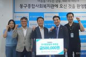 전국신문언론노동조합 이의용 기자 | 부산 동구, 동구종합사회복지관은 근로복지공단 부산지역본부에서 10월 1일 추석 명절을 앞두고, 동구 지역 소외계층에게 힘이 될 수 있도록 50만 원의 후원금을 동구종합사회복지관에 전달했다고 밝혔다. 해당 성금은 동구 지역 내 취약계층의 추석 명절맞이 지원으로 활용될 예정이다. 이외에도 근로복지공단 부산지역본부에서는 임직원들이 매주 수요일마다 복지관 4층 장난감도서관을 방문해 어린아이들이 안전하게 놀 수 있도록 장난감 소독 봉사활동에 꾸준히 참여하고 있다. 민병창 근로복지공단 부산지역본부장은 “어른, 아이 할 것 없이 모두가 행복하고 즐거운 동구가 될 수 있도록 앞으로도 다양한 활동을 통해 사회공헌사업을 이어나가겠다” 고 밝혔다.