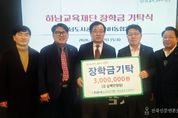 전국신문언론노동조합 기자 | NH농협은행 하남시지부는 하남시 지역인재 양성을 위해 하남교육재단에 장학금 3백만원을 기탁했다. NH농협은행 하남시지부는 하남시 인재 육성을 위해 12년동안 꾸준히 장학금을 지원하고 있으며, 이번 기탁금은 하남시 학생들의 학업지원에 활용할 예정이다. 이석표 지부장은“지역 학생들의 성장과 미래를 응원하는 마음으로 장학금을 전달했다”며 “앞으로도 지역인재 양성을 위한 다양한 지원을 이어가겠다”고 말했다. 이현재 시장(하남교육재단 이사장)은 “NH농협은행 하남시지부의 꾸준한 관심과 후원에 감사드린다”며 “기탁금이 학생들의 꿈을 키우는 데 도움이 되도록 소중히 사용하겠다”고 밝혔다. 하남교육재단은 관내 초·중·고등학생들을 대상으로 장학사업을 비롯해 캠퍼스 투어, 기업체험, 진로·진학 프로그램, 학부모 교육 등 다양한 교육 지원 사업을 운영하고 있으며, 매년 약 3만여명의 학생들이 교육서비스를 제공받고 있다.