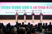 전국신문언론노동조합 강찬희 기자 | 대전시의회 조원휘 의장은 12일 대전시청에서 개최된 대전충남 행정통합 설명회 및 시민 한마음 촉구대회에 참석해 지방소멸 위기 속에서 진행되는 대전·충남 행정통합 특별법안의 조속한 의결을 시민들과 함께 촉구했다. 이번 행사는 지역을 대표하는 단체·기관장, 민관협의체, 직능·사회단체 등 600여 명이 참석한 가운데 행정통합 홍보영상 상영을 시작으로 주요내빈 인사말씀, 행통통합 설명, 촉구문 낭독 및 퍼포먼스 순으로 진행됐다. 조원휘 의장은 “지방 소멸, 수도권 1극 체제라는 국가적 위기 속에서 행정통합은 대전과 충남의 생존과 미래에 대한 가장 현실적이고 강력한 해답이고, 두 지역이 힘을 모으면 인구 350만 명, 지역내총생산 200조 원의 대한민국 3대 생활권을 이뤄내는 것이다”라면서, “대전시의회는 행정통합특별위원회를 출범해 제도 개선 및 시민 공감대 형성 등 선제적 정책 마련에 총력을 기울여 왔고, 앞으로도 국회와 국가 차원의 협력을 도모해 충청권이 대한민국 100년을 이끌 새로운 성장 축이 되도록 시민들과 함께 힘을 모아 반드시 이뤄내겠다”고 말했다.