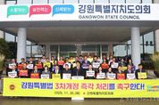 전국신문언론노동조합 강찬희 기자 | 강원특별자치도의회는 25일 오후 1시 30분 도의회 본관 앞에서 ‘강원특별법 3차 개정안’의 조속한 국회 심사를 촉구하는 결의대회를 열었다. 이번 결의대회는 개정안이 발의된 이후 국회에서 심사조차 제대로 이뤄지지 않고 있는 상황에 대한 도민들의 인내 한계와 지역 균형발전에 대한 요구가 높아진 데 따른 것이다. 강원특별법 3차 개정안은 지난해 9월 한기호 의원과 송기헌 의원이 공동 발의했으나 현재까지 단 한 차례도 행안위 법안심사소위가 개최되지 않는 등 심사 지연이 장기화되고 있는 것으로 알려졌다. 정기국회 종료가 임박한 상황에서 이번 회기 내 법안 처리를 위한 시급성도 부각되고 있다. 이날 결의대회에는 국회 앞에서 릴레이 1인 시위를 이어가고 있는 박윤미 부의장과 이한영 운영위원장을 제외한 전 도의원이 참석했다. 문관현 기획행정위원장이 낭독한 결의문에는 ▲ 강원특별법 3차 개정안의 즉각 처리 요구 ▲ 개정안이 통과될 때까지 끝까지 투쟁하겠다는 결의 ▲ 300만 강원도민의 생존권 수호하겠다는 의지가 담겼다. 도의회는 결의대회 직후 결의문을