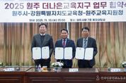 전국신문언론노동조합 강찬희 기자 | 강원특별자치도교육청은 원주시, 원주교육지원청과 11월 18일 원주시청에서 ‘원주 더나은교육지구 연장지정 업무협약’을 체결했다. 이번 협약은 2018년 제1기 4년, 2022년 제2기 4년 운영에 이어 2026년부터 4년간 제3기 더나은교육지구 사업을 새롭게 추진하기 위해 마련됐다. 세 기관은 ‘배움과 성장, 문화예술로 동행하는 원주’라는 비전 아래 학교와 지역이 함께 성장하는 지속가능한 교육생태계 조성을 위해 매년 4억 원(교육청 2억 원, 군 2억 원)을 공동 지원한다. 원주 더나은교육지구는 학생의 전인적 성장을 지원하는 지역 중심 교육협력 사업으로, 학교·지자체·지역사회가 협력하는 ‘배움과 성장의 지역교육공동체’를 구축하고 있다. 지구중점 공동사업으로 △‘원주 한바퀴’ 원주 탐방 프로젝트 △‘원주 한바탕’ 원주 체험 프로젝트를 운영해 학생들이 지역의 역사·문화·자연을 탐방하며 원주 시민으로서의 정체성과 자긍심을 기를 수 있도록 돕는다. ‘예술 피움’ 사업은 △‘꿈키움’ 찾아가는 문화예술 소공연 △‘꿈그림’ 그림책·영상 창작 프로젝트 △‘꿈도약’ 리더십 스포츠