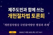 전국신문언론노동조합 김성길 기자 | 제주특별자치도의회, 제주특별자치도 주민자치위원회협의회, 제주대학교 리걸클리닉센터, 제주미래디자인포럼, 사회적협동조합 제주로 공동 주최로 11월 25일 오전 10시, 제주특별자치도의회 1층 대회의실에서 '제주도민과 함께 쓰는 개헌절차법 토론회'를 개최한다. 국민주권 시대에 국민이 주도하는 헌법 개정 요구가 커지고 있고 이에 시민의회 방안, 국민청원 방안, 추진협의회 방안 등 국민참여방안을 담은 개헌절차법안이 3건이 국회에 발의됐지만 3건 법안의 국민참여방안은 제주도민의 의견을 충분히 반영하기에는 미흡하다는 지적이 있음에따라 이번 토론회는 제주도민의 목소리가 실질적으로 담길 수 있는 개헌절차법 제정 방안을 깊이 있게 모색하기 위해 마련됐다. 토론회는 이상봉 제주특별자치도의회 의장의 인사말로 시작하여 이남근 제주특별자치도의회 의원이 좌장을 맡고 신용인 제주대학교 로스쿨 교수가 '개헌절차법상 국민참여 방안 쟁점과 과제'를 주제로 발표할 예정이다. 또한 고정학 제주특별자치도주민자치위원회협의회장, 신훈민 변호사, 양광수 아라동 주민자치위원장, 조현주 국민주도상생개헌행동 상임공동대표가 제