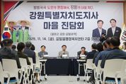 전국신문언론노동조합 강찬희 기자 | 김진태 강원특별자치도지사는 '강원특별법' 군사특례를 활용한 첫 권한 행사로 지난 3월 군사규제 개선 성과를 거둔 철원군을 11월 14일 방문해 도지사 ‘마을진담회’(진솔한 +간담회)의 네 번째 자리를 마련했다. 이번 진담회는 주민과의 소통을 강화하고, 현장의 의견을 보다 폭넓게 듣기 위해 철원군을 김화·갈말권역과 철원·동송권역의 두 개 권역으로 나누어 진행했다. 이날 행사에는 김진태 지사를 비롯해, 한기호 국회의원(춘천, 철원, 화천, 양구을), 이현종 철원군수, 김정수·엄기호 도의원, 이장, 주민자치위원, 노인회 등 각계각층의 주민 300여 명이 참석해 뜨거운 관심 속에 진담회가 시작됐다. 이현종 철원군수는 “이번 방문은 지사님께서 철원을 아끼고 주민의 애로사항을 듣고 신속히 반영하고자 하는 마음의 표현”이라고 말했다. 이어 “철원군은 군사규제 100만평 완화, 농업진흥지역 3만 4천 평 해제 등 규제 개선의 가시적 성과를 이뤄냈다”고 설명했다. 또한, “수돗물 하수처리시설 개선을 위해 도비 약 60~70억 원을 지원받아 추진 중이며, 신철원과 와수 지역은 그