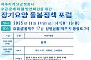 전국신문언론노동조합 김성길 기자 | 제주특별자치도는 제주지역 요양보호사 인력수급 문제 해결을 위해 오는 11월 14일 오후 2시 호텔샬롬제주 컨벤션홀에서 전문가와 현장 종사자들이 한자리에 모여‘장기요양 돌봄 정책 포럼’을 개최한다고 밝혔다. 이번 포럼은 제주장기요양요원지원센터(센터장 김성건) 주관으로 열리며, 도내 장기요양기관 대표 및 종사자 등 약 120여 명이 참석할 예정이다. 급속한 고령화로 인한 돌봄 인력 부족 문제를 진단하고, 제주지역의 지속 가능한 인력 수급 체계 구축 방안을 모색하기 위해 마련됐다. 포럼은 개회식을 시작으로 주제발표, 종합토론, 질의응답 순으로 진행된다. 첫 번째 주제발표에서는 이희승 박사(국민건강보험공단 건강보험연구원 장기요양정책연구센터 부연구위원)가‘전국 요양보호사 인력 현황과 향후 과제’를 주제로 전국 단위의 인력 현황과 정책적 과제를 짚는다. 이어 김재희 센터장(제주연구원 고령사회연구센터)이‘제주지역 요양보호사 인력 수급 전망 및 정책 과제’를 주제로 발표하며, 제주지역의 현실과 향후 정책 방향을 제시할 예정이다. 이후 진행되는 종합토론에