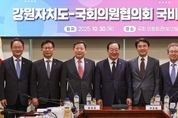 전국신문언론노동조합 강찬희 기자 | 김진태 강원특별자치도지사는 10월 30일 오후 2시, 국회 의원회관에서 도내 지역구 국회의원 7명과 함께 도 국회의원협의회를 열고 2026년도 국비 추가 확보 방안 등을 논의했다. 이번 간담회는 2026년도 정부예산안의 국회 심의가 본격화되는 시점에 맞춰 도와 지역 국회의원 간 협력체계를 강화하기 위해 마련된 자리로, 김 지사를 비롯해 지역구 국회의원 보좌진이 참석해 예산 확보 전략을 중심으로 실무적인 논의를 진행했다. 이 자리에서 도는 올해 국비 10조 원 시대를 처음으로 연 성과를 바탕으로 정부 예산안에 미반영된 24개 사업(총 612억 원)의 국비 추가 확보 방안을 논의하고, 해당 사업들이 국회 심의 과정에서 반드시 반영될 수 있도록 국회의 적극적인 협력을 요청했다. 이와 함께 ▲용문~홍천 광역철도 예타 통과 ▲삼척~강릉 고속화철도 예타 통과 ▲포천~철원 고속도로 예타 통과 ▲소양8교 건설 국비 반영 ▲제5차 국가철도망 구축계획 및 제6차 국도‧국지도 건설계획 최대 반영 등 강원지역 주요 에스오시(SOC) 현안과제에 대해서도 폭넓은 논의가 이뤄졌다. 한기호