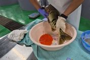전국신문언론노동조합 강찬희 기자 | 경상북도 민물고기연구센터는 11월 1일 산란을 위해 울진 왕피천으로 돌아오는 어미연어 첫 포획이 시작되어 본격적인 종자생산 작업에 들어갔다. 이번에 포획된 어미연어는 13마리(암컷 6, 수컷 7), 전장 70㎝급으로, 이곳에서 3~4년 전 방류된 어린 연어가 북태평양을 회유하며 성장한 뒤 왕피천으로 돌아온 개체다. 연구센터는 왕피천 하류에 길이 250m 포획장을 설치해 어미연어를 포획, 채란, 종자를 생산해 내년 봄 60만 마리의 치어를 왕피천에 방류한다. 올해는 10월 지속적인 강수로 인해 포획장 설치 지연으로 첫 포획이 다소 늦어졌으나, 지금부터 주 산란 시기로 목표량 달성에 최선을 다할 예정이다. 아울러 수산 계열 고등학생을 대상으로 채란, 수정, 부화 등 인공부화 전 과정을 체험할 수 있는 현장학습 프로그램도 운영한다. 연어 방류 사업은 하천 개발 등으로 산란장이 훼손되어 연어의 자연 산란이 어려워짐에 따라 경북도에서 1970년부터 이어온 사업으로, 인공부화를 통한 치어방류로 도내에 연어가 회귀하는 하천을 계속 보존하기 위한 중요한 사업이다.