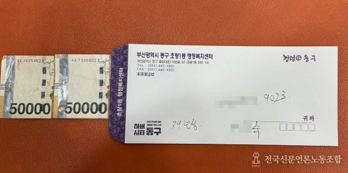 전국신문언론노동조합 이의용 기자 | 부산 동구 초량1동은 지난 5일, 익명의 기부자가 호우로 피해를 입은 주민을 위해 써달라며 초량1동행정복지센터에 성금 10만원을 기부해 잔잔한 감동을 전했다고 밝혔다.