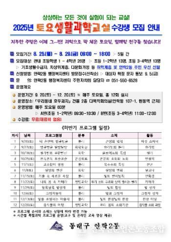 전국신문언론노동조합 이의용 기자 | 부산 동래구 안락2동 주민자치회는 오는 8월 25일부터 29일까지 초등학생 1~4학년을 대상으로 한‘토요생활과학교실' 수강생을 선착순 모집할 계획이다.
