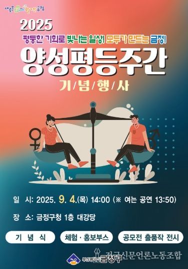 전국신문언론노동조합 이의용 기자 | 부산시 금정구는 오는 9월 4일 금정구청 1층 대강당에서 2025년 양성평등주간(9.1.~9.7.)을 맞아 양성평등 문화 확산과 인식제고를 위해 구민과 함께하는 기념행사를 개최한다고 밝혔다.