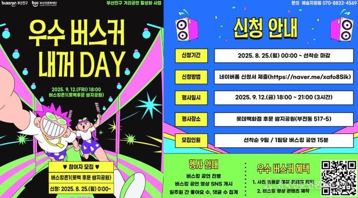 이번 부산진구 거리공연 활성화 사업 '우수 버스커 내꺼DAY' 참여는 네이버폼 제출을 통해 선착순으로 8월 25일부터 모집한다.
