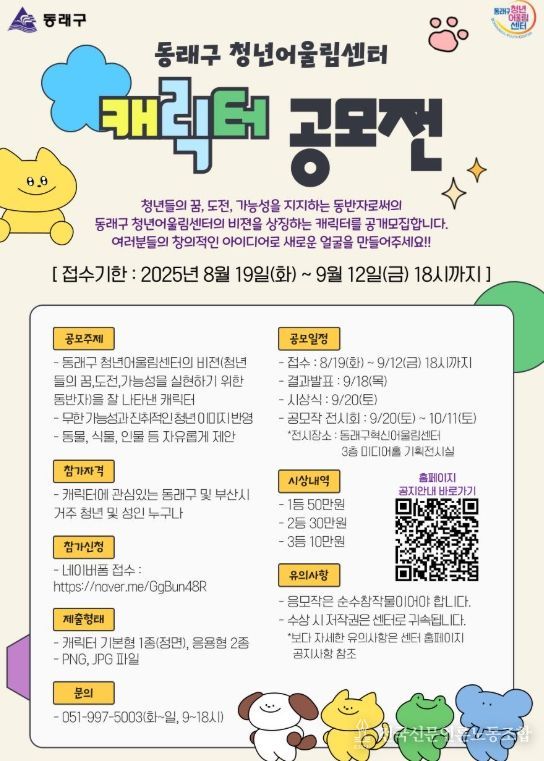 공모 주제는 동래구 청년어울림센터의 비전인 청년들의 ▲꿈 ▲도전 ▲가능성 ▲실현의 동반자 ▲진취적인 청년 이미지가 반영된 캐릭터다.동물, 식물, 인물 등 자유롭게 제작해 응모하면 된다.