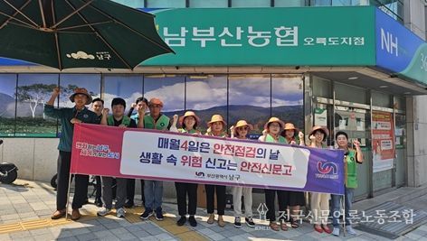 전국신문언론노동조합 이의용 기자 | 부산 남구는 8월 안전 점검의 날을 맞이하여, 지난 25일 용호동 남부산농협 용호지점 일원에서 주민 안전의식 향상과 여름철 재난 예방을 위해 ‘안전한바퀴’ 캠페인을 펼쳤다.