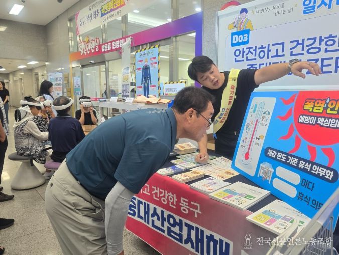 전국신문언론노동조합 이의용 기자 | 부산 동구는 지난 26일, 청사 로비에서 개최된 일자리 박람회에서 ‘안전하고 건강한 동구, 중대재해 ZERO’라는 주제로 '중대산업재해 예방 캠페인'을 진행했다.