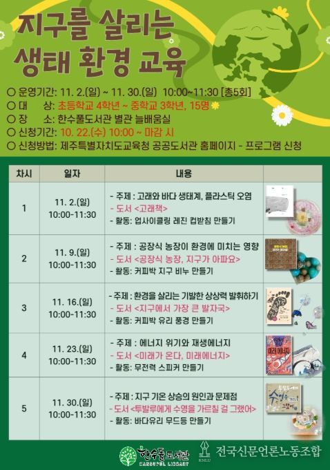 전국신문언론노동조합 김성길 기자 | 제주도교육청 한수풀도서관은 그림책 속 생태·환경 이야기를 통해 어린이와 청소년이 생활 속 환경보호의 중요성을 이해하고 자연에 대한 감수성을 기를 수 있는 ‘2025년 지구를 살리는 생태·환경 교육’ 참가자를 모집한다.