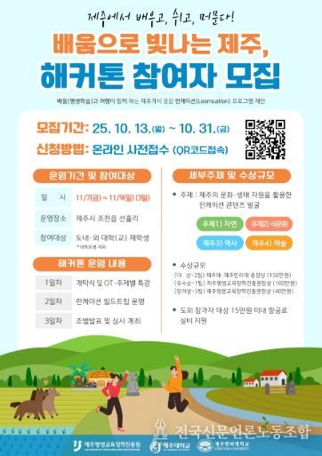 전국신문언론노동조합 김성길 기자 | 제주평생교육장학진흥원은 '제주가치 공감, 런케이션'사업의 일환으로 ‘배움으로 빛나는 제주, 해커톤’을 개최하며, 오는 10월 31일까지 참가자를 모집한다고 밝혔다.