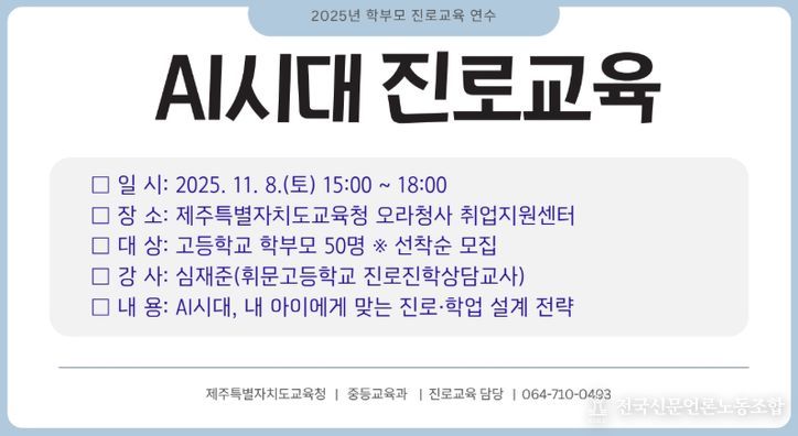 전국신문언론노동조합 김성길 기자 | 제주특별자치도교육청은 11월 8일 오후 3시 도교육청 오라청사 취업지원센터에서 도내 고등학교 보호자 50명을 대상으로 ‘인공지능 시대 진로교육’ 연수를 운영한다고 밝혔다.