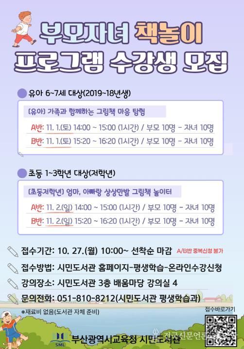 전국신문언론노동조합 조창제 기자 | 부산광역시립시민도서관은 다음달 1일부터 이틀간 시민도서관 배움마당 강의실에서 학부모와 자녀 80명을 대상으로 ‘하반기 부모자녀 프로그램’을 운영한다.