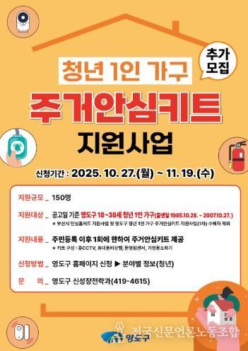 전국신문언론노동조합 조창제 기자 | 부산 영도구는 지역 내 청년 1인 가구의 주거 안심도를 높이고 사회적 고립감을 해소하는 등 안전한 주거환경을 조성하고자 ‘청년 1인 가구 주거안심키트 지원사업’을 1차에 이어 2차로 추가 모집에 나선다.
