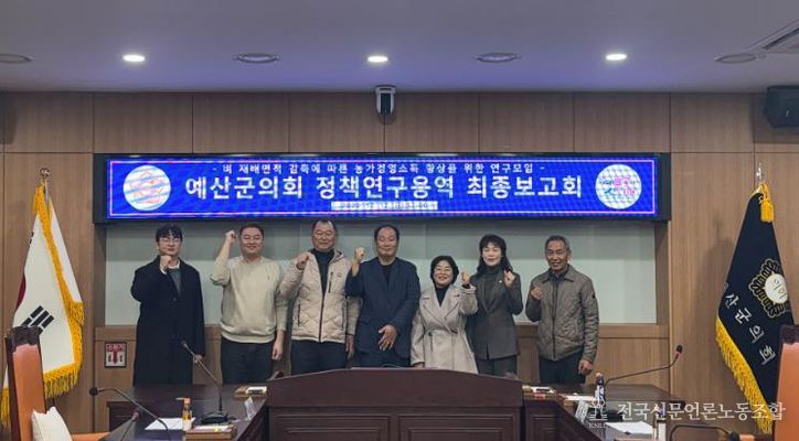 전국신문언론노동조합 강찬희 기자 | 예산군의회는 12일 군의회 문화강좌실에서 '벼 재배면적 감축에 따른 농가경영소득 향상을 위한 정책연구용역' 최종보고회를 개최했다.