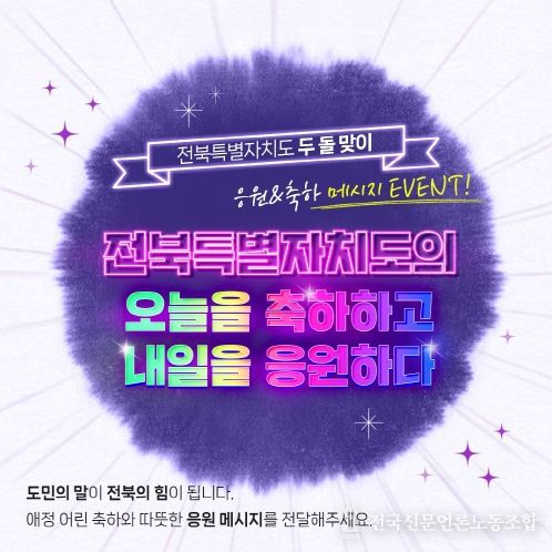 전국신문언론노동조합 김성길 기자 | 전북특별자치도는 출범 2주년을 맞아 도민이 직접 참여하는 '도민 참여 축하·응원 메시지 이벤트'를 1월 12일부터 23일까지 운영한다.