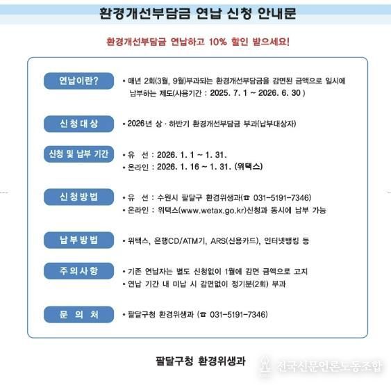 전국신문언론노동조합 기자 | 수원시 팔달구는 환경개선부담금 납부 대상자를 대상으로 1월 31일까지 환경개선부담금 연납 신청을 받는다.