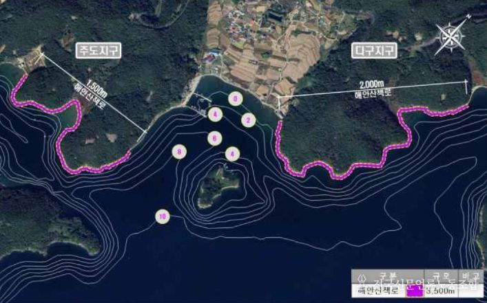 창원 주도·다구지구는 진동면 요장리~다구리 일원에 해안산책로(L=3,500m)를 조성하는 사업이다. 대상지는 남파랑 둘레길(남파랑길 11코스)에 해당해 이용객이 증가하는 곳이나, 해안산책로가 단절돼 있어 지역 주민과 관광객들에게 불편과 위험을 초래하고 있었다.