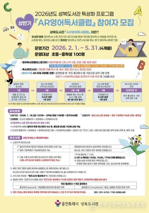 전국신문언론노동조합 기자 | 용인특례시 성복도서관은 오는 16일부터 2026년 ‘AR(Accelerated Reader)영어독서클럽’ 상반기 참여자 100명을 모집한다고 15일 밝혔다.