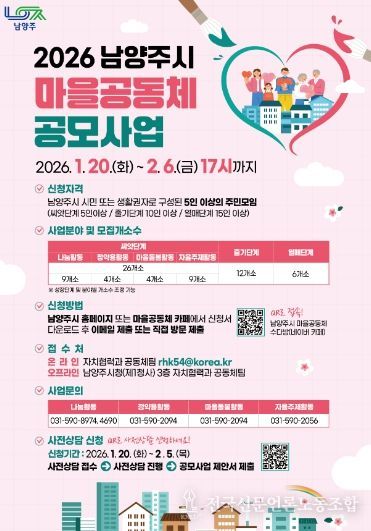 전국신문언론노동조합 기자 | 남양주시는 1월 20일부터 2월 6일까지 ‘2026년 마을공동체 공모사업’참여 공동체를 공개 모집한다.
