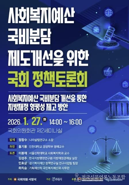 이에 따라 이번 토론회에서는 현행 사회복지예산의 국비·지방비 분담 구조가 지역별 재정 여건과 복지 수요의 차이를 충분히 반영하지 못하고 있는 점을 점검하고, 지방재정의 형평성을 높일 수 있는 합리적 제도개선 방향을 논의할 예정이다.