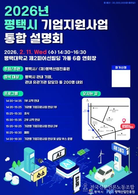 전국신문언론노동조합 기자 | 평택시가 평택산업진흥원과 함께 오는 2월 11일 평택대학교 제2피어선빌딩 6층 대강당에서 ‘평택 중소기업 지원사업 설명회’를 개최한다.