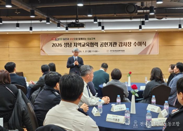 전국신문언론노동조합 기자 | 경기도성남교육지원청은 1월 27일 스카이파크 호텔에서 '성남 지역교육협력 공헌기관 감사장 수여식'을 개최하여 성남교육 발전을 위해 협력해 온 지역교육협력기관 22곳에 감사의 뜻을 전했다.