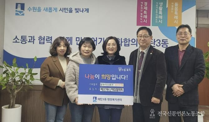 전국신문언론노동조합 김성길 기자 | 수원시 영통구 매탄3동은 지난 3일 매탄3동 단체장협의회가 다가오는 설 명절을 맞아 관내 어려운 이웃들을 위해 누리상품권 300장(총 300만원 상당)을 기부했다고 밝혔다.