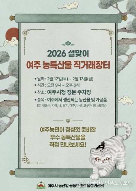 전국신문언론노동조합 김성길 기자 | 여주시는 설 명절을 맞아 지역 농업인의 판로를 확대하고 시민들의 장바구니 부담을 줄이기 위해 오는 2월 12일부터 13일까지 이틀간 ‘2026 설맞이 여주 농특산물 직거래장터’를 개최한다.