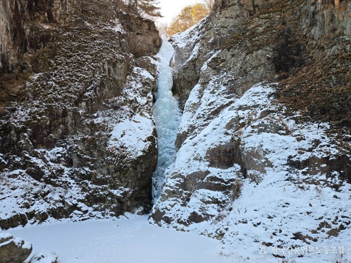 전국신문언론노동조합 김성길 기자 | 2월의 한겨울, 충북 영동군 심천면에 위치한 옥계폭포가 빙벽과 어우러진 웅장한 겨울 풍경으로 방문객들의 시선을 사로잡고 있다.