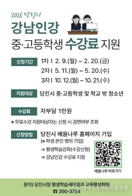 전국신문언론노동조합 강찬희 기자 | 당진시는 사교육비로 인한 부모들의 경제적 부담 덜기 위해 당진시 중고등학생과 학교 밖 청소년을 대상으로 ‘강남인강’ 수강료를 지원한다고 6일 밝혔다.