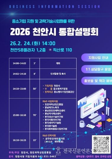 전국신문언론노동조합 강찬희 기자 | 천안시는 오는 24일 천안과학산업진흥원과 함께 천안SB플라자에서 ‘중소기업 지원 및 과학기술사업화를 위한 2026 천안시 통합설명회’를 개최한다고 11일 밝혔다.