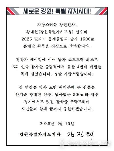 전국신문언론노동조합 강찬희 기자 | 김진태 도지사는 15일 2026 밀라노-코르티나담페초 동계올림픽대회 남자 쇼트트랙 1,500m에서 은메달을 획득한 강원특별자치도 소속 국가대표 황대헌 선수를 축하하며 축전을 보냈다.
