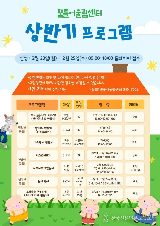전국신문언론노동조합 강찬희 기자 | 영유아와 초등학생들의 건강한 성장을 돕는 꿈틀어울림센터가 오는 23일부터 ‘2026년 상반기 프로그램’ 수강생을 모집하며 아이들의 활기찬 봄맞이를 준비한다.