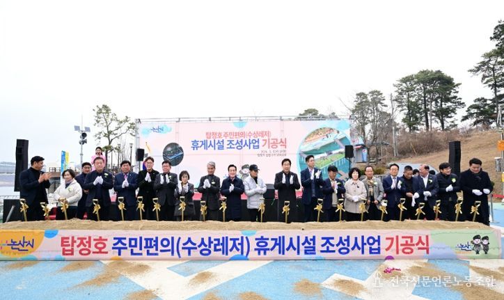 시는 6일 탑정호 출렁다리 남문광장에서 백성현 논산시장을 비롯해 조용훈 논산시의회의장, 도·시의원, 농어촌공사 등 유관기관, 지역대표 등 100여 명이 참석한 가운데 ‘탑정호 주민편의(수상레저)휴게시설 조성’기공식을 개최했다.